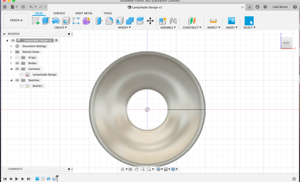 This is as far as I got on the bowler hat. After I filleted the cylinder and the expanded circle for the rim, I couldn’t properly figure out how to shell the rest of it. I tried using the shell function to make dip in the upper section of the rim too but couldn’t quite manage it. This is definitely half-finished, but I’m more of a glass-half-full kinda guy anyway, so no big deal.